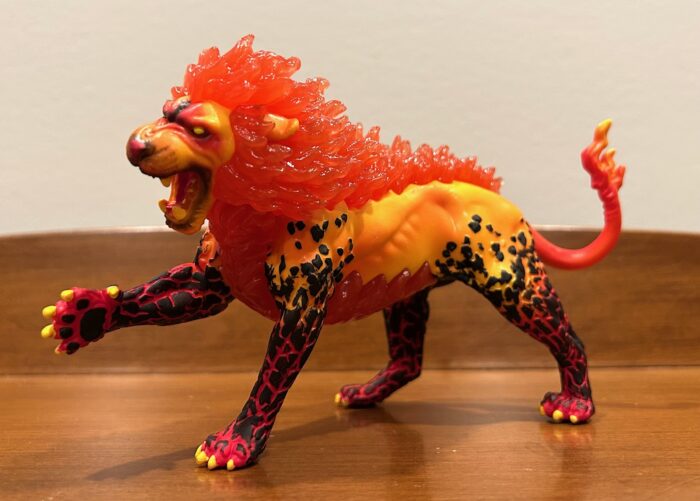 The fire lion is posed ready to strike, with its right front paw raised, its mouth open in a fiery roar, its body bent to the left, and its tail curled.