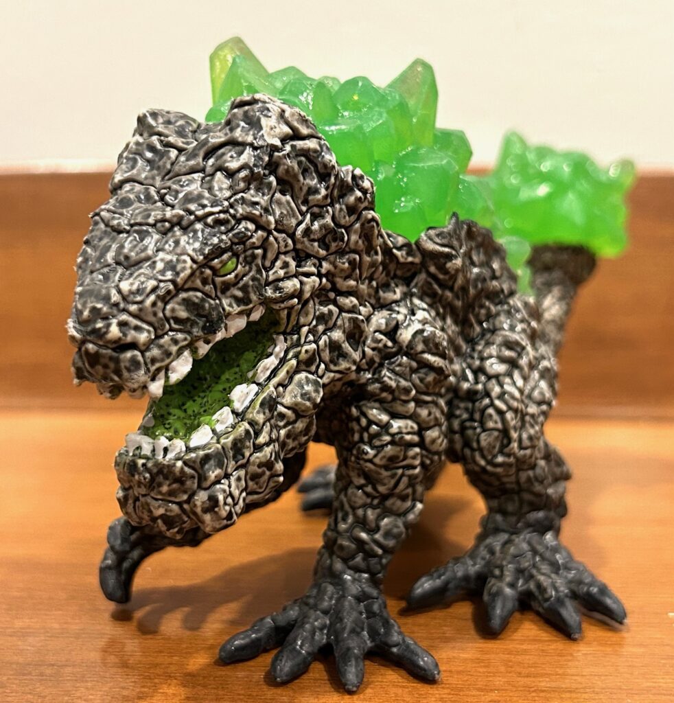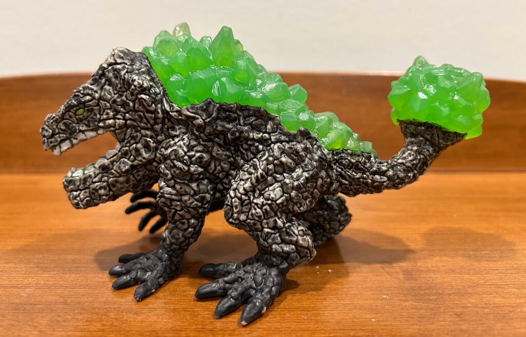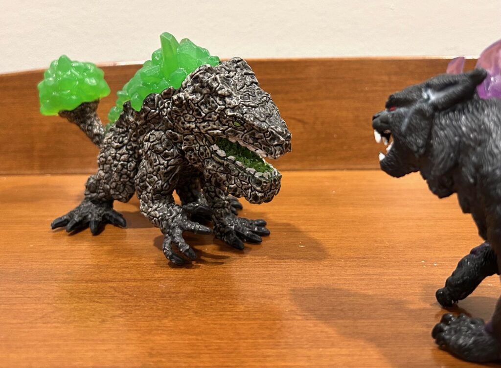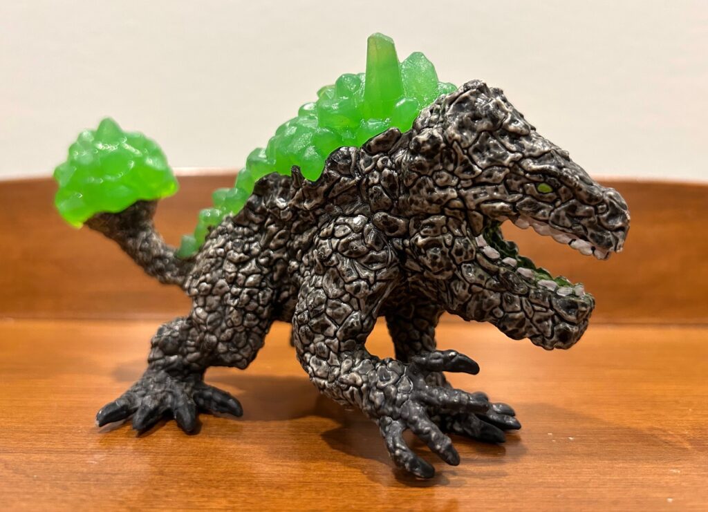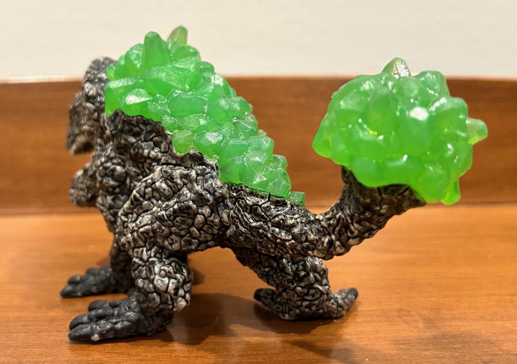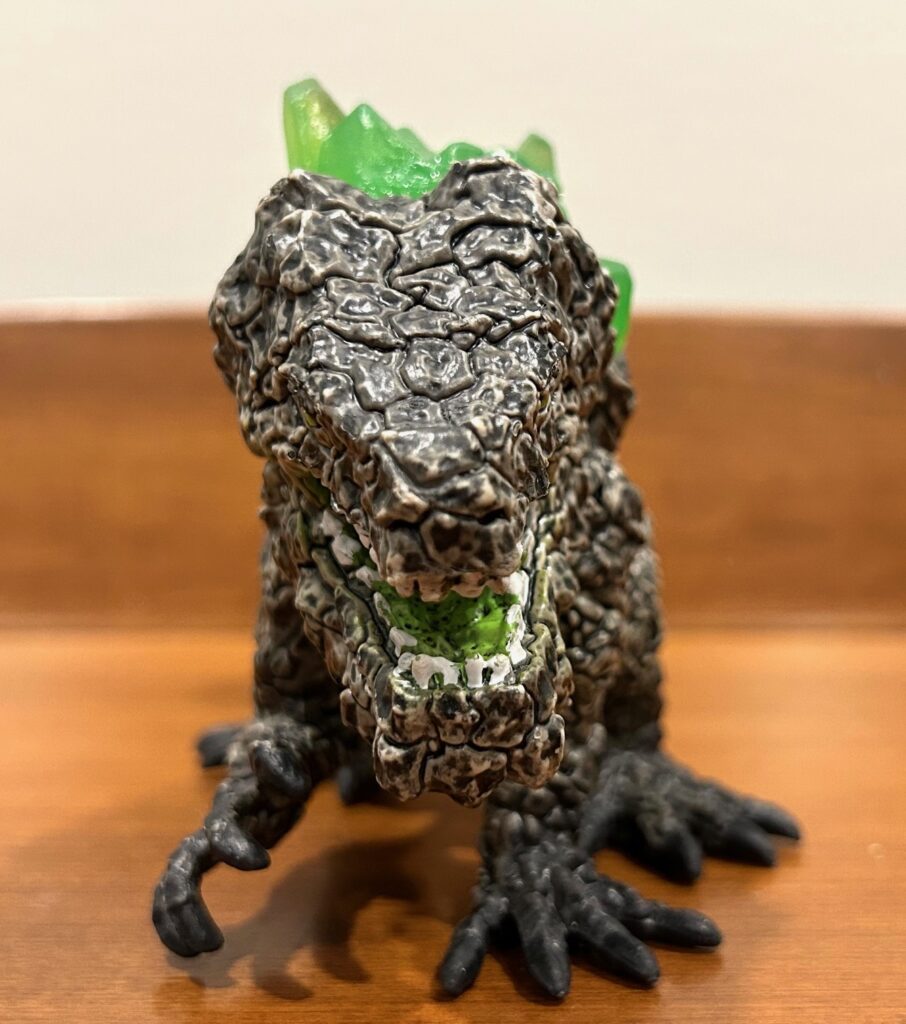 Unlike its neighbour, the rock beast, the rock crusher’s body is made entirely stone. And particularly detailed stone at that. The surface is rough and craggy, and the black wash does a good job of bringing out every nook and cranny. The crystals on the back and the tail club are uneven and jagged, but like all Schleich toys, there are no real sharp edges to speak of. This toy is perfectly safe for children to play with.