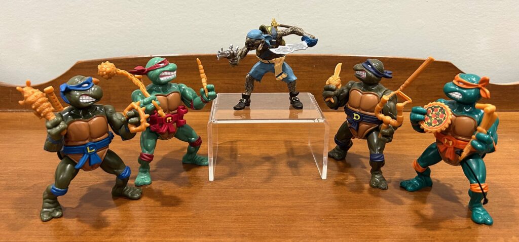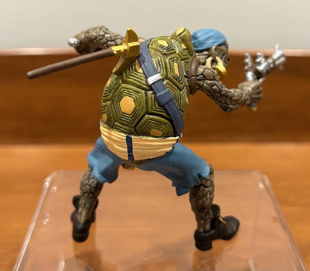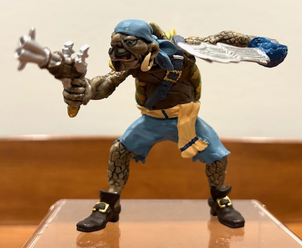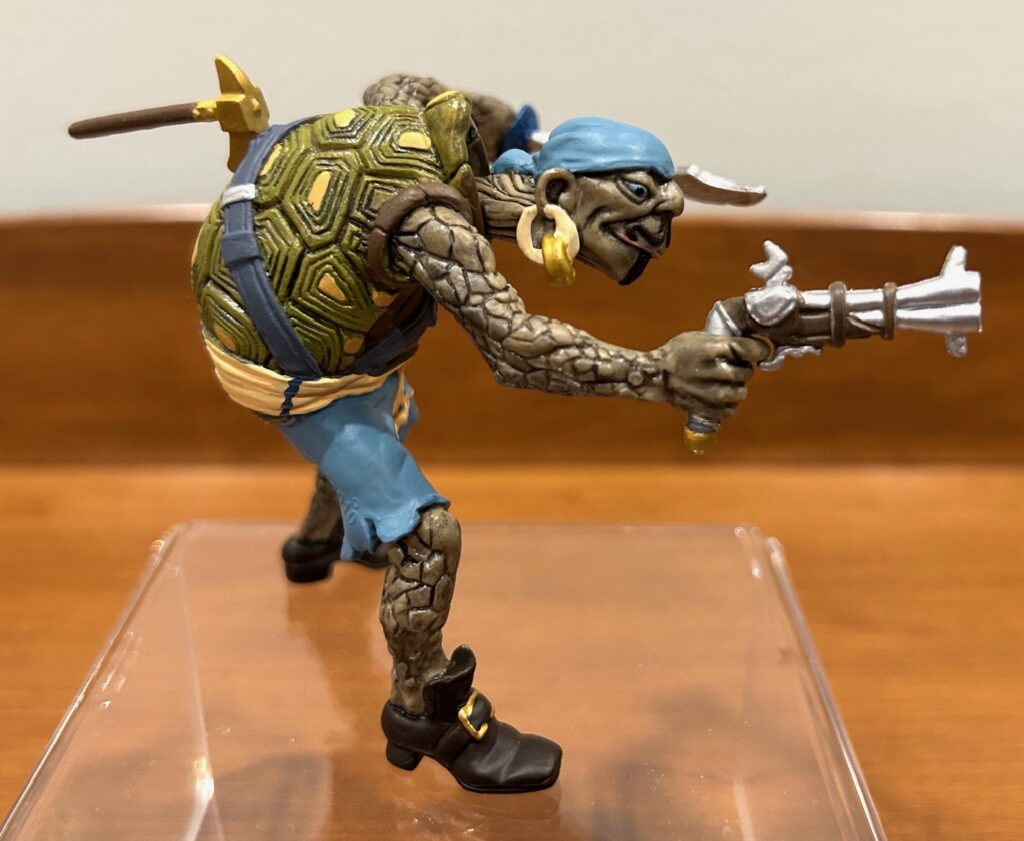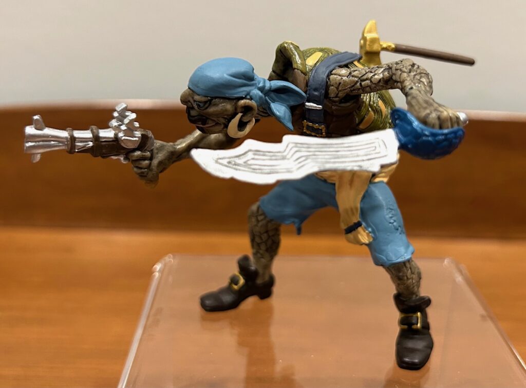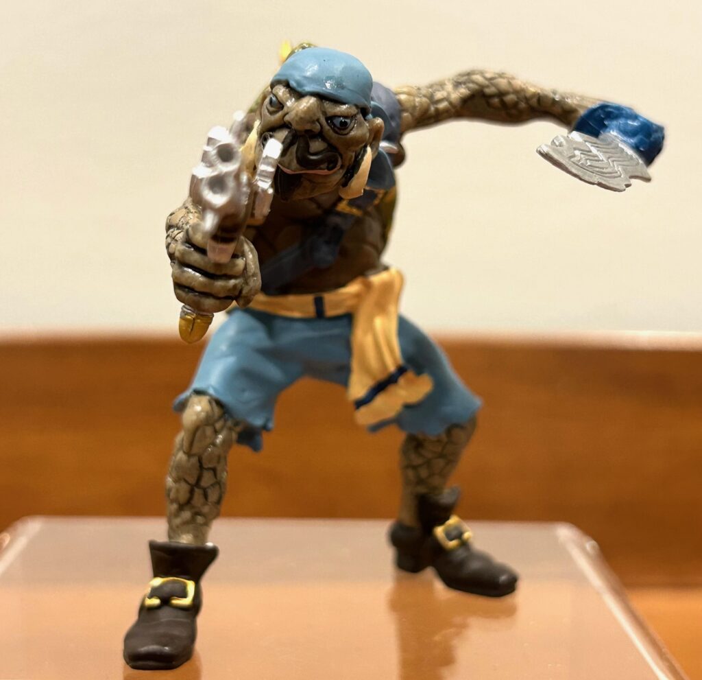 Being a mutant turtle, our boatswain has grey-brown skin washed over with black. His plastron is dark brown and his carapace is dull green with dull yellow markings. His head is grey-brown with blue eyes and a black moustache and goatee. Yes, despite being reptilian, he does have facial hair. And external ears to boot. At the same time, his visage is distinctly turtle-ish, with a large, beaky upper lip and a pronounced chin. Plus there’s his long, wrinkled neck. His arms and legs are scaly and his shell is covered in grooved patterns.